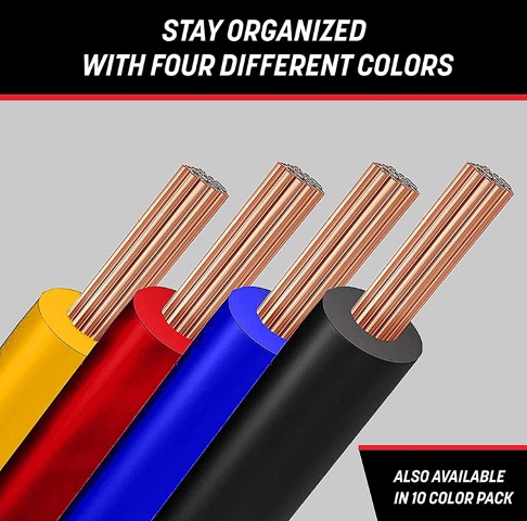 • Our 16 gauge copper wire is available as a 4 color pack, a 6 color pack, and a 10 color pack – all your wiring needs are covered.