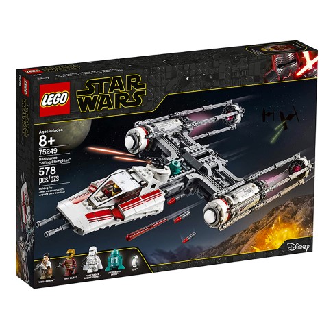 A LEGO Y-wing fighter from Star Wars: The Rise of Skywalker with spring-loaded shooters and bomb-drop function.